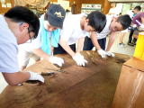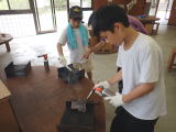 | 型木の角をけずる → バーナーで焼く → みがく → フックをつける → 飾りをつける | |||