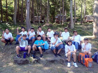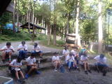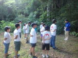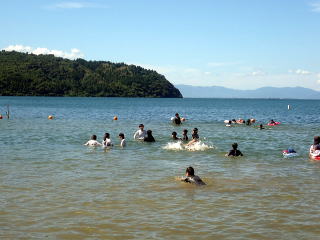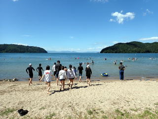 | 入村式・昼食・テント設営・水着に着替え | いざ、びわ湖へ! 向こうには沖島 | 水泳ではなく、気持ちよい水浴 | 陸上監視もバッチリ |